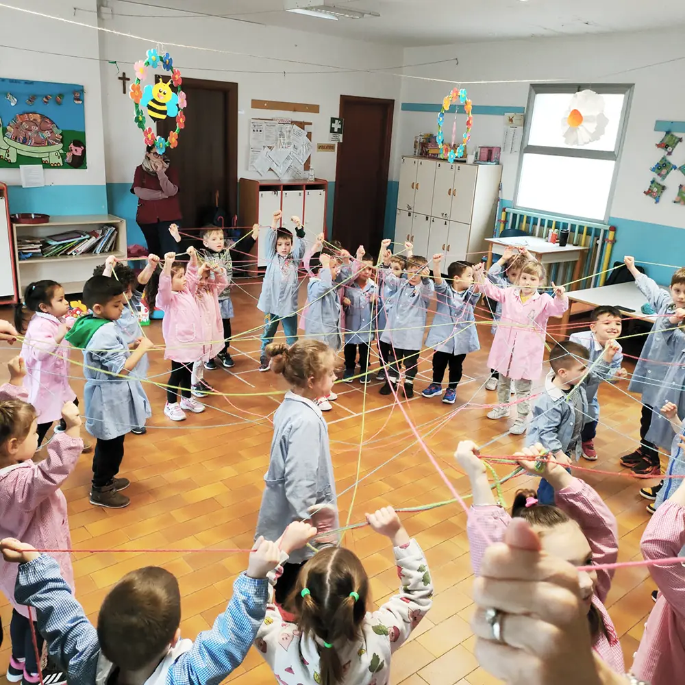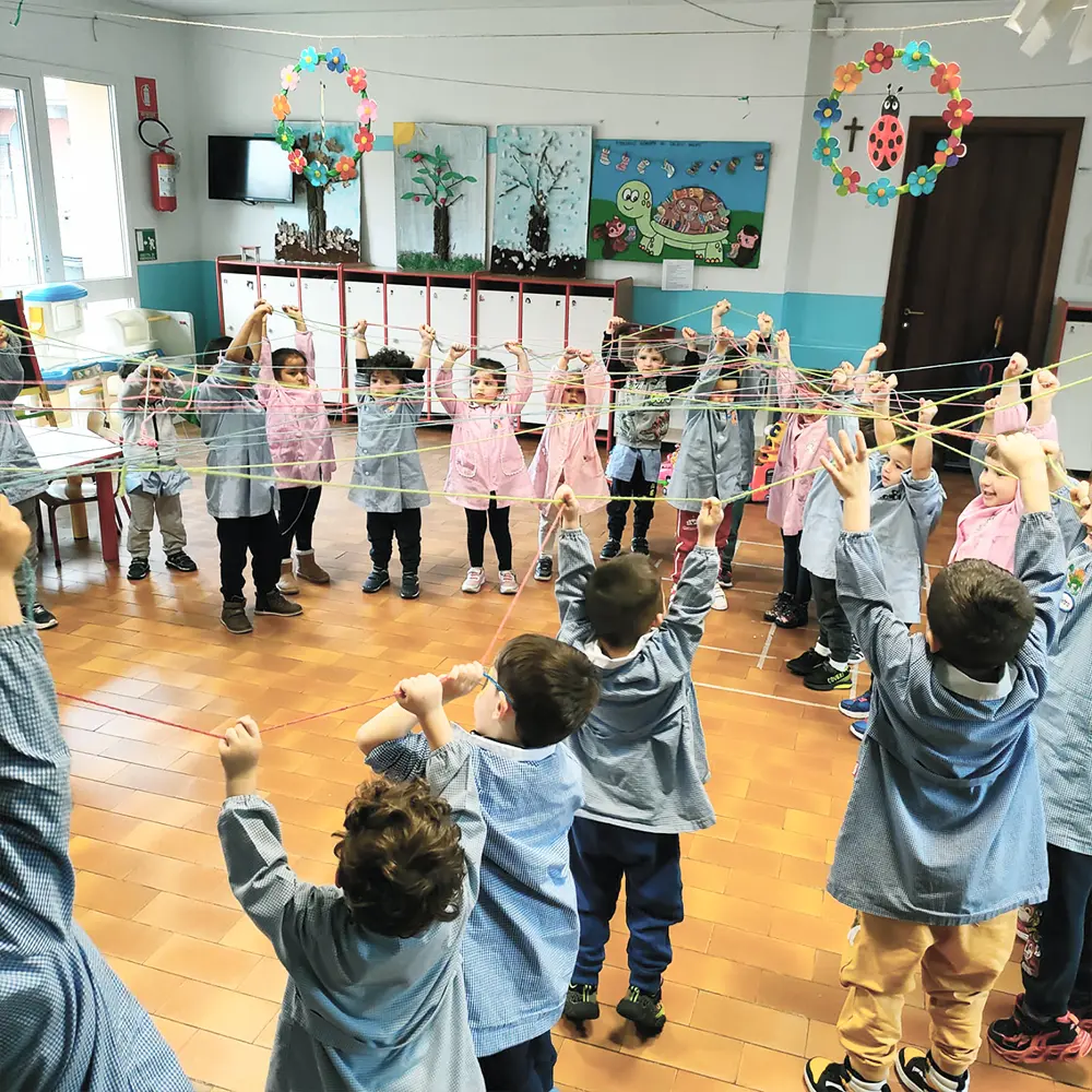 Al termine i bambini seduti in cerchio, scambiandosi un filo di lana, hanno realizzato una rete intrecciata, simboleggiando il legame che li unisce superando le differenze attraverso l’amicizia reciproca.